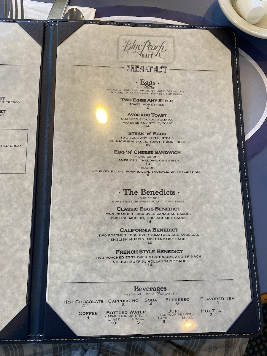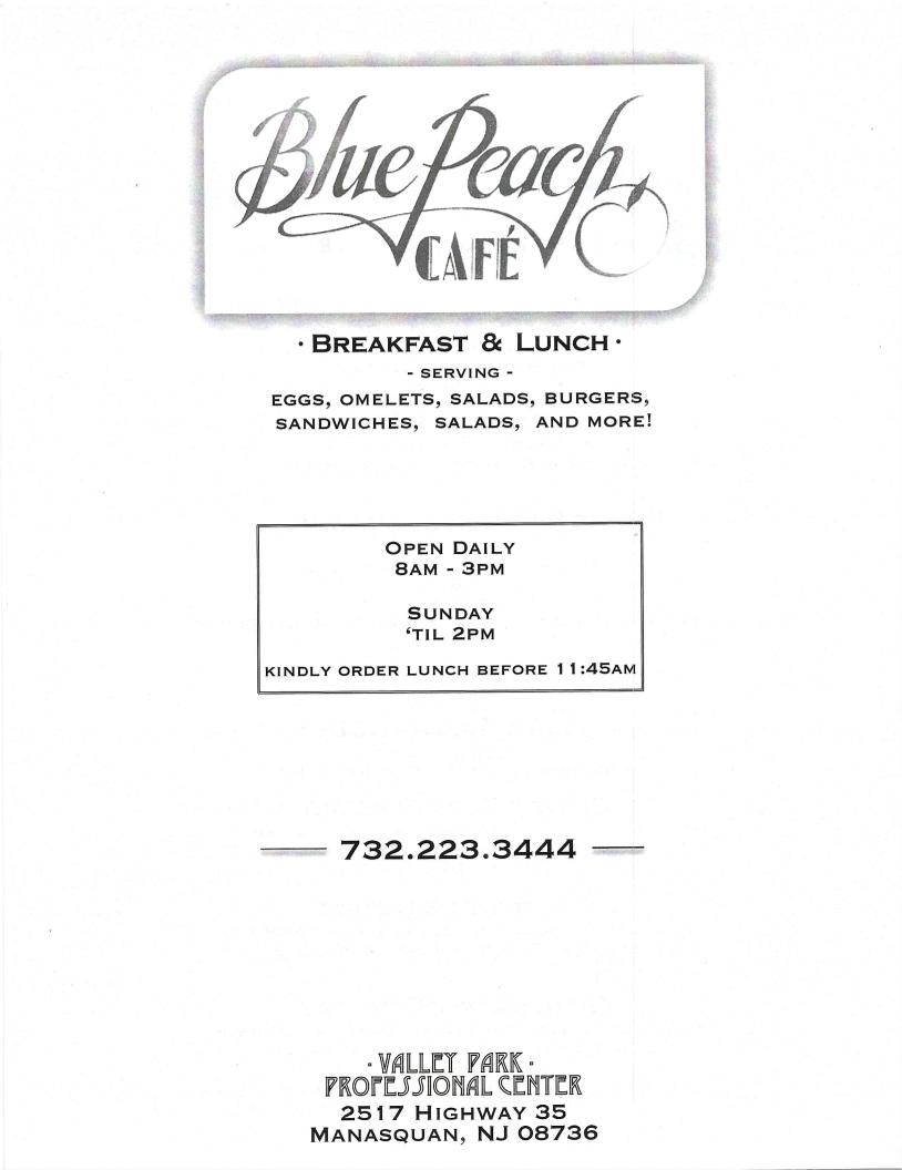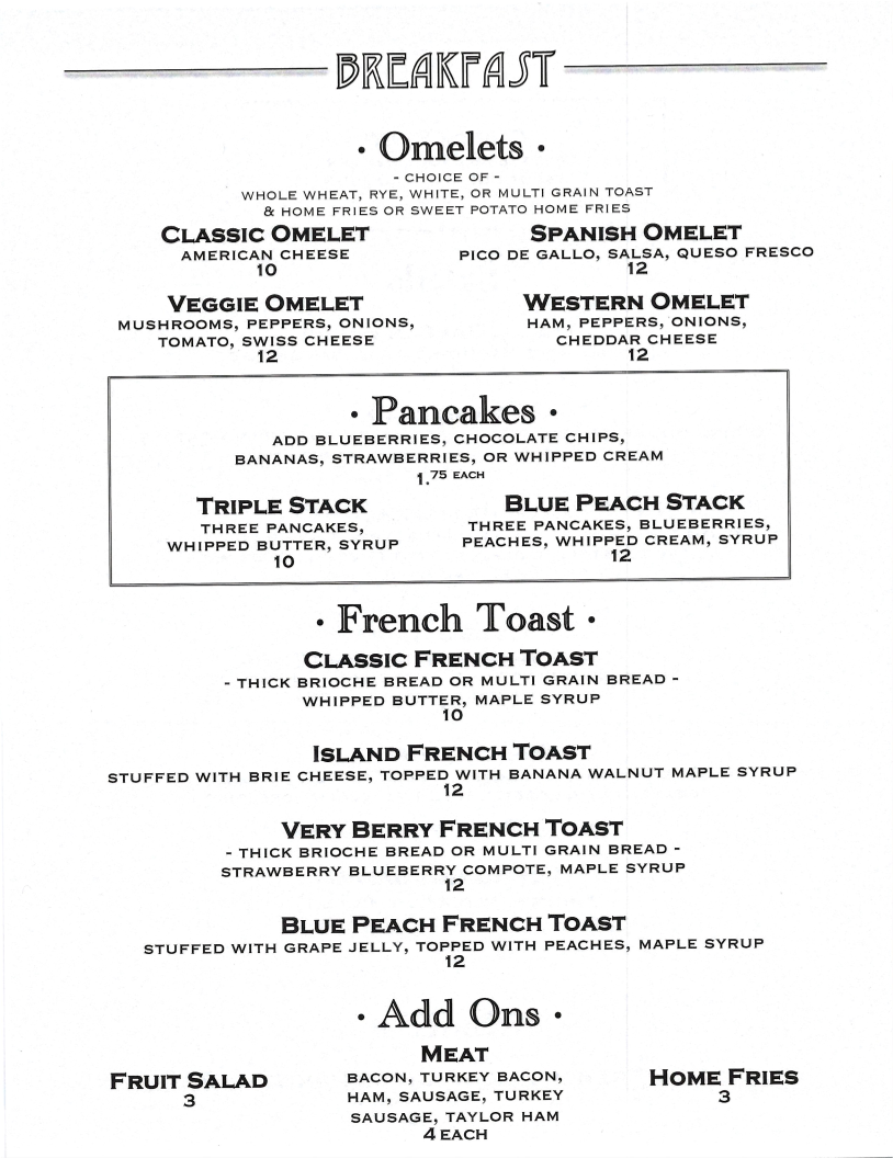 THREE PANCAKES, BLUEBERRIES, PEACHES, WHIPPED CREAM, SYRUP